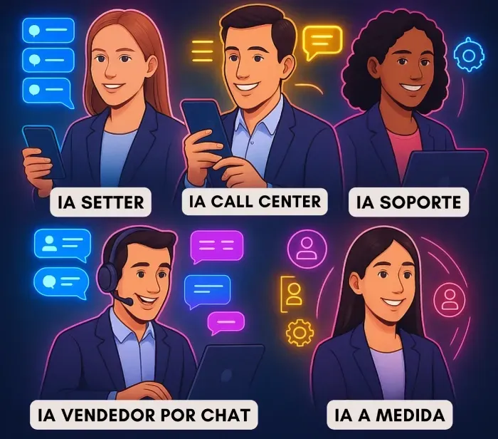 Implementamos Agentes de Inteligencia Artificial que prospectan, atienden llamadas, venden por chat y dan soporte a tus clientes, como un equipo humano… pero más rápido, más barato y siempre disponible.